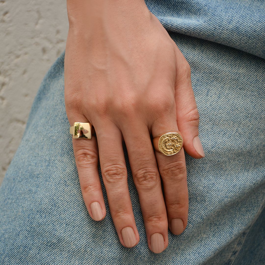"O anel Amaris é de metal liso possui uma base com uma Lua e Estrelas com pontos de luz cravejados de micro zircônias na cor cristal e é folheado a ouro 18k.