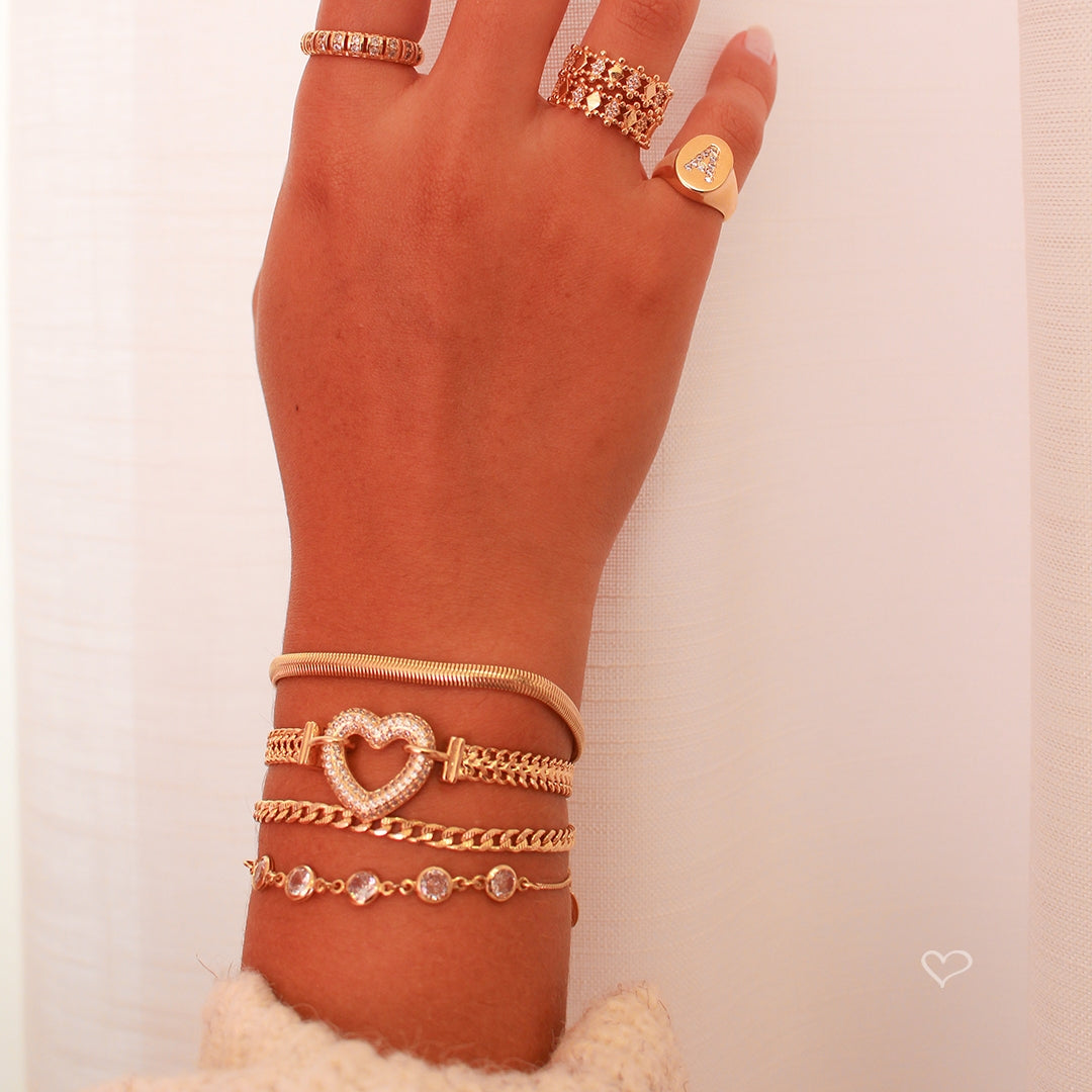 "O anel Celine é todo trabalhado, possui mine losangos intercalados sem um com metal liso e outro cravejado com zircônias na cor cristal e é folheado a ouro 18K.