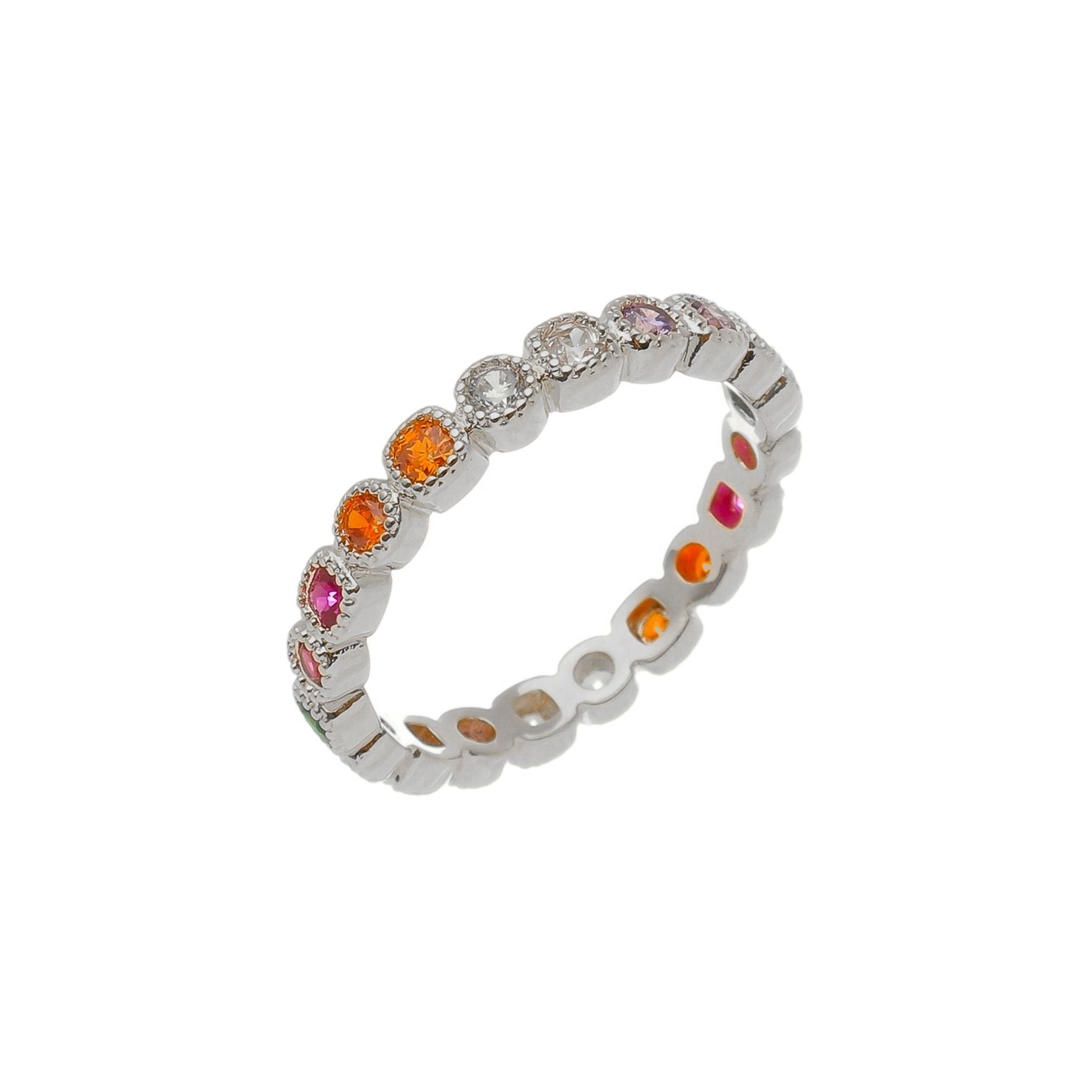 "O anel Fani é composto por zircônias nas cores cristal, laranja, pink, esmeralda e lilás é folheado em ródio branco.