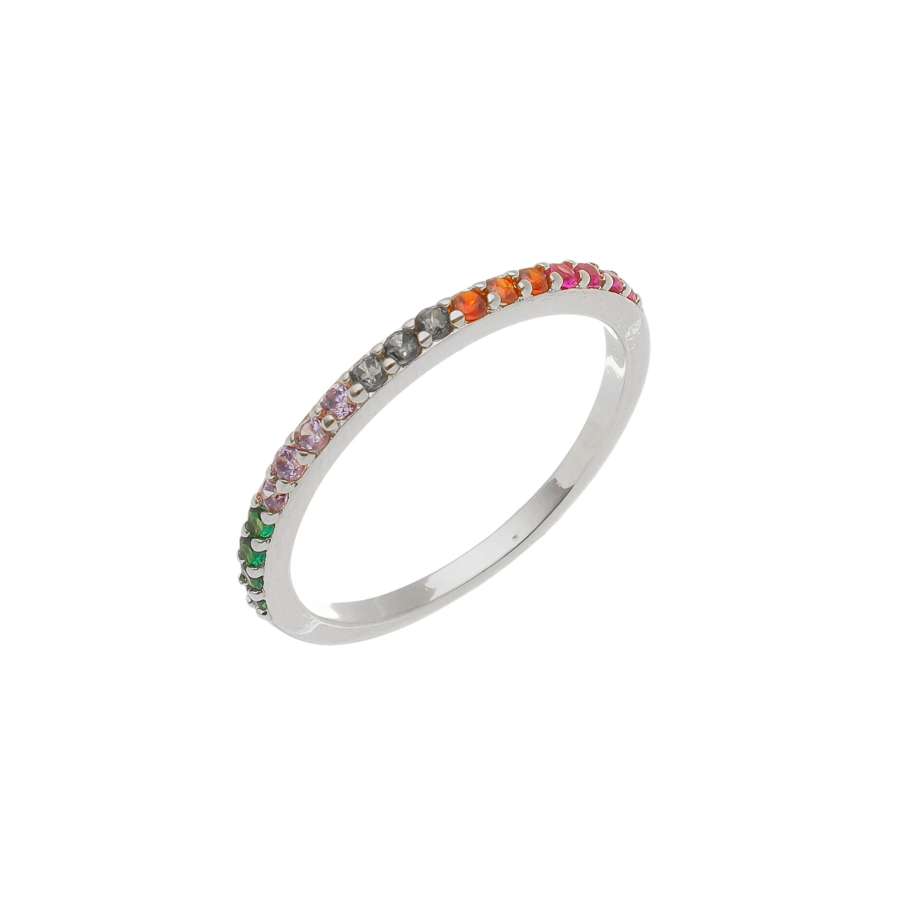 "O anel Sofi é fino, cravejado com zircônias nas cores pink, laranja, morganita, lilás e esmeralda e é folheado em ródio branco.