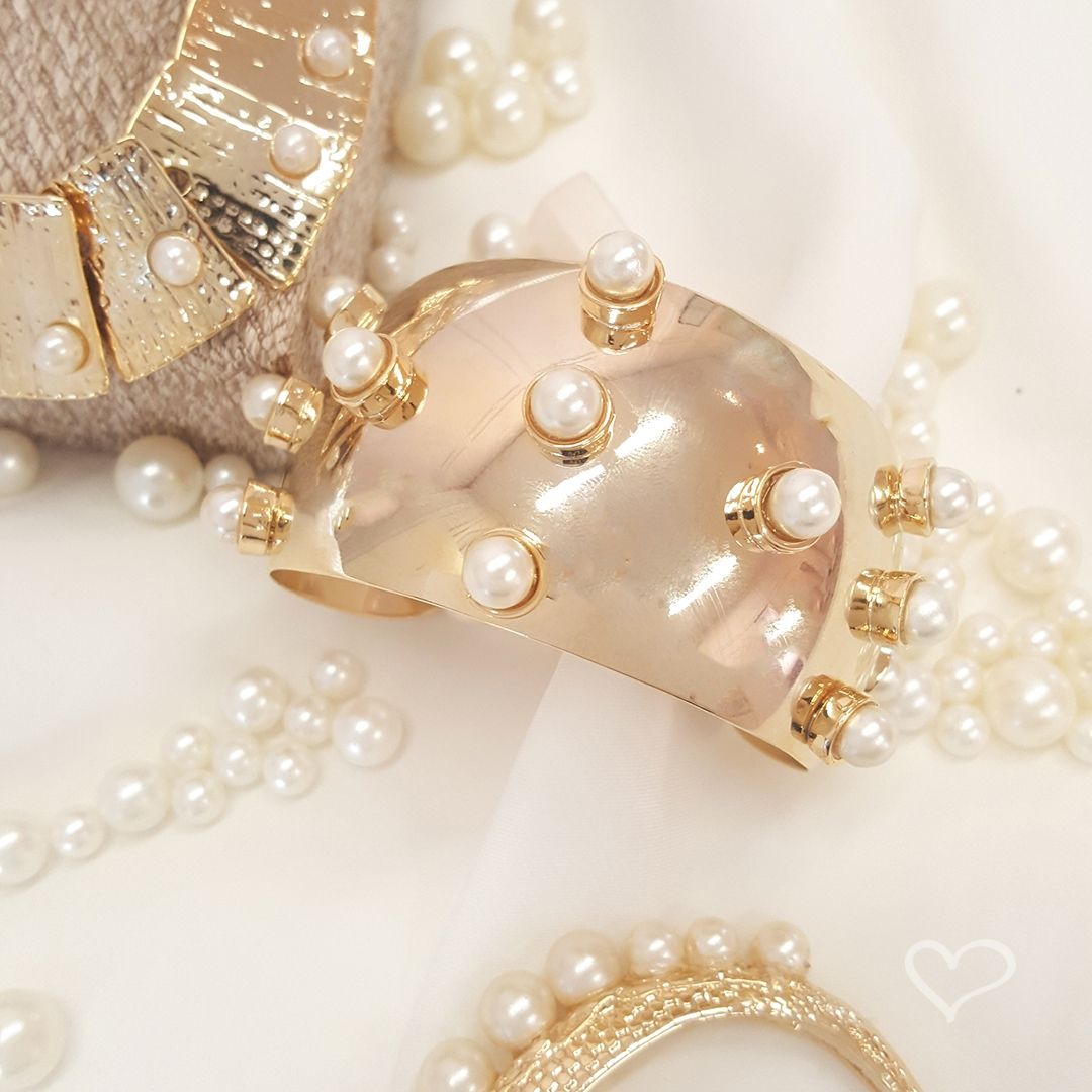 O Bracelete Nísia é simplesmente deslumbrante! Ele apresenta um design largo com pérolas ao longo de toda a sua extensão, e o toque final é o folheado a ouro 18k.