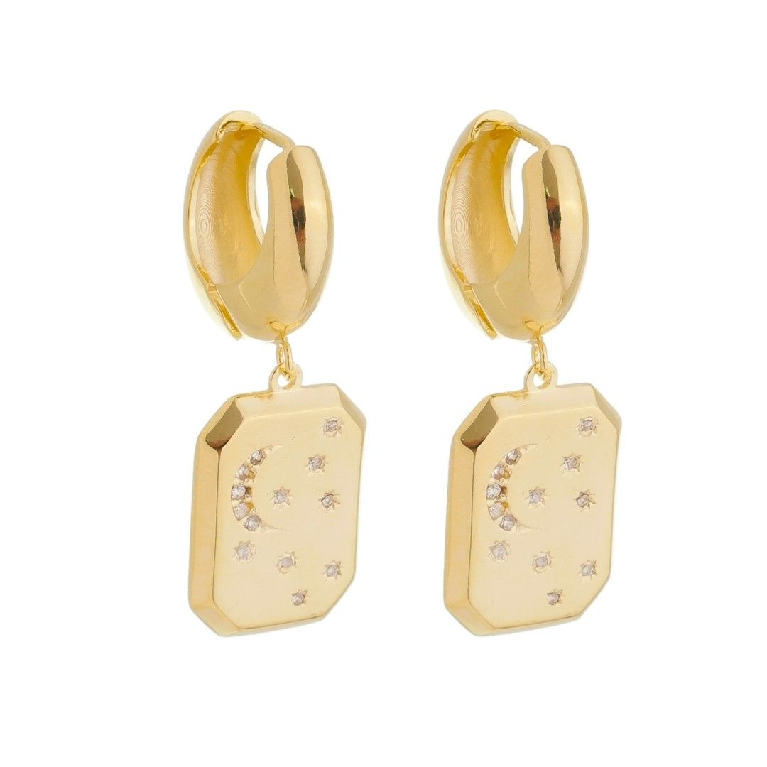 "O brinco Centauri possui uma argolinha articulada com um pingente placa com uma lua e estrelas cravejadas de zircônias na cor cristal e é folheado a ouro 18k.