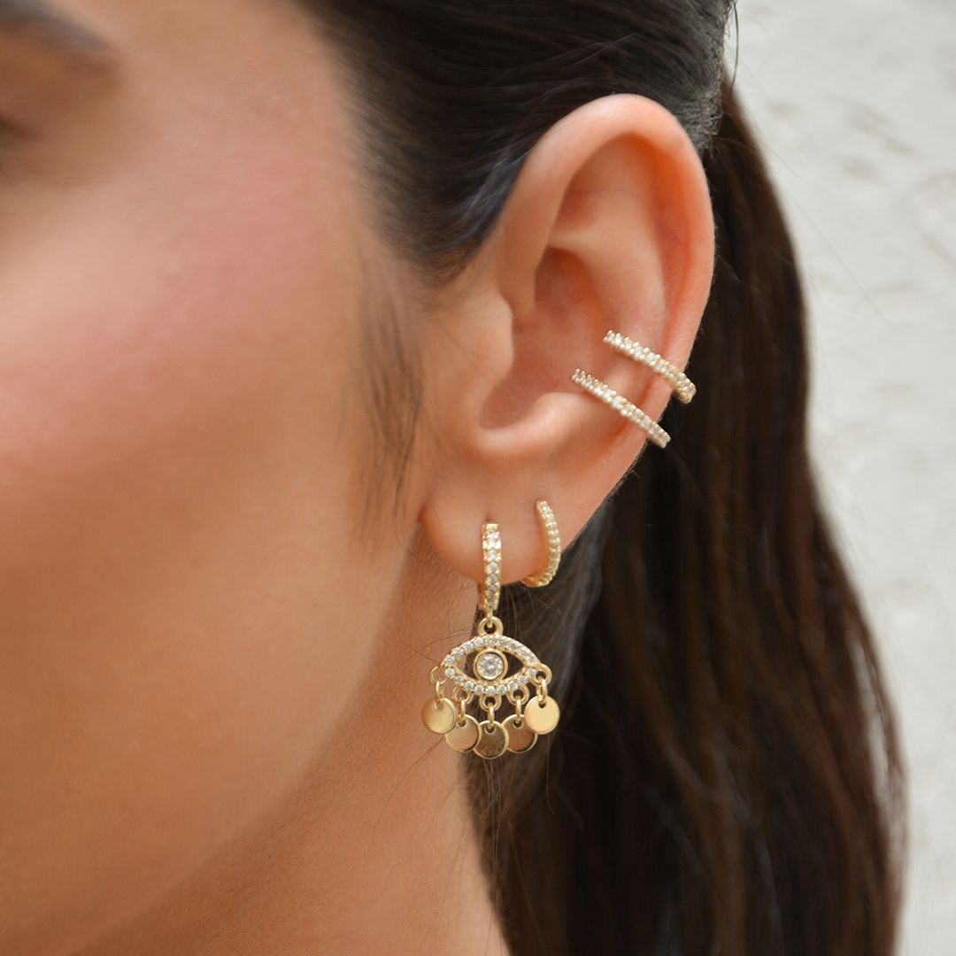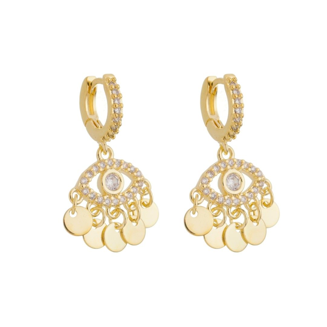 "O brinco Cleo é composto por uma argolinha cravejada com mini zircônia na cor cristal, pingente de olho grego cravejado com mini zircônias na cor cristal e com mini medalhinhas penduras por toda sua extensão, possui fecho click e é folheado a ouro 18k.