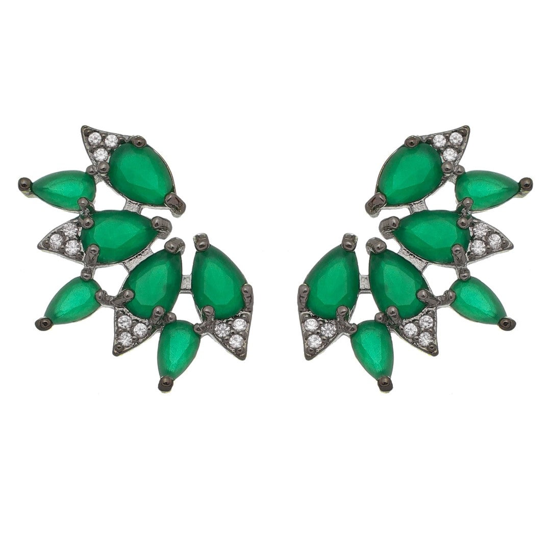 "Esse brinco é no formato de leque com gotas de zircônias na cor esmeralda, na ponta da gota zircônias cravejadas na cor cristal e é folheado em ródio negro.
