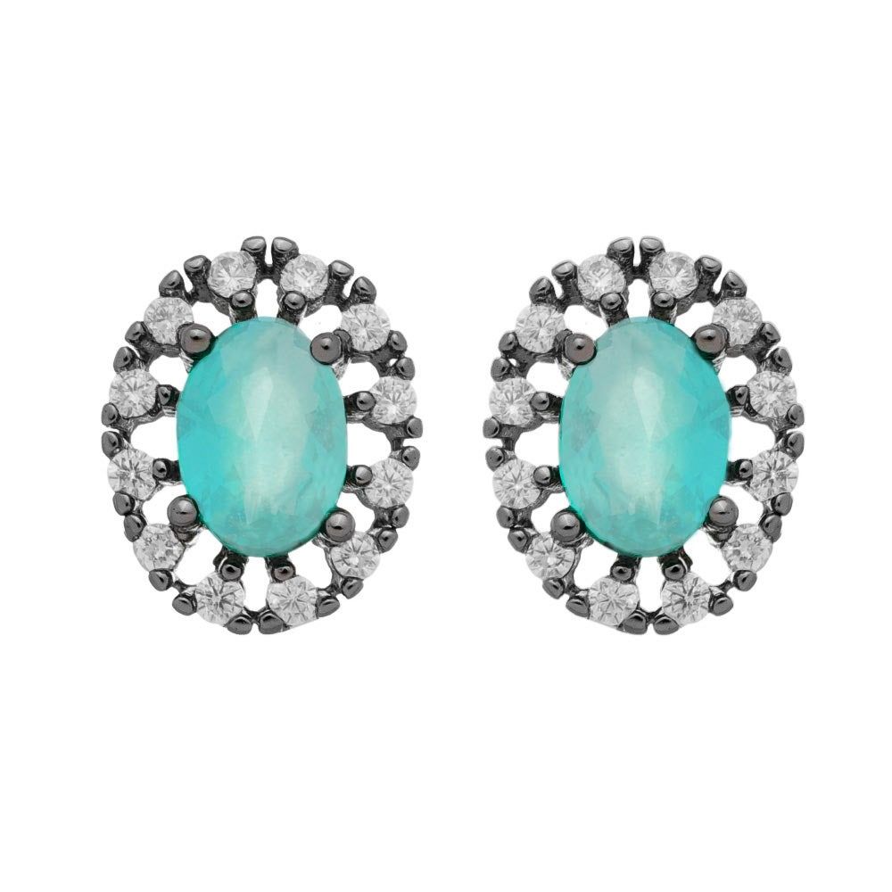 O Brinco Piuka Oval Folheado em Ródio Negro com Zircônias Cristal cravejadas ao redor de uma deslumbrante zircônia na cor acqua.