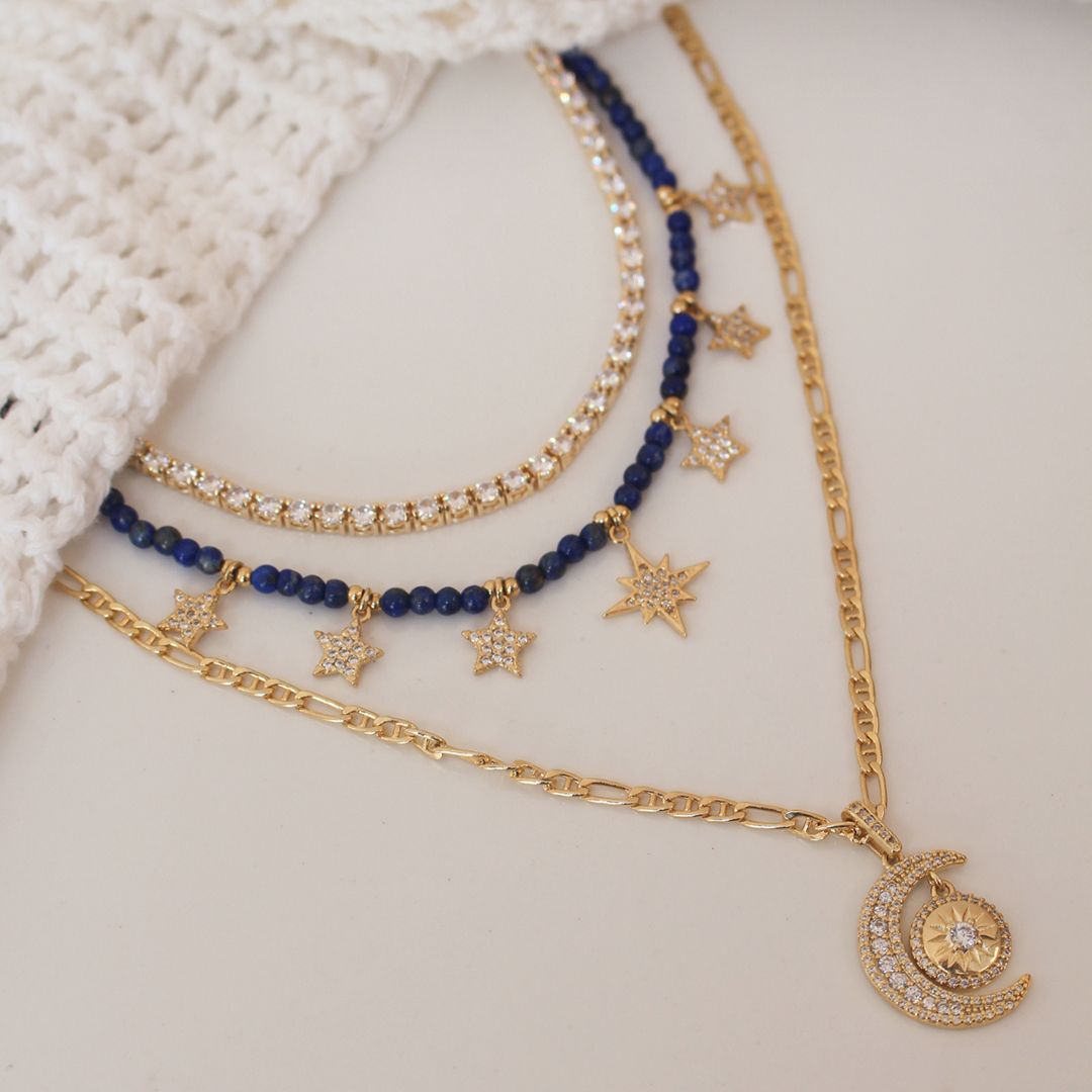 "A choker Auria é confeccionada em zircônias lapidadas na cor safira com entremeios de bolinhas de metal na cor dourada, com pequenos pingentes de mini estrelas por toda sua extensão, possui fecho lagosta extensor e é folheada a ouro 18k.