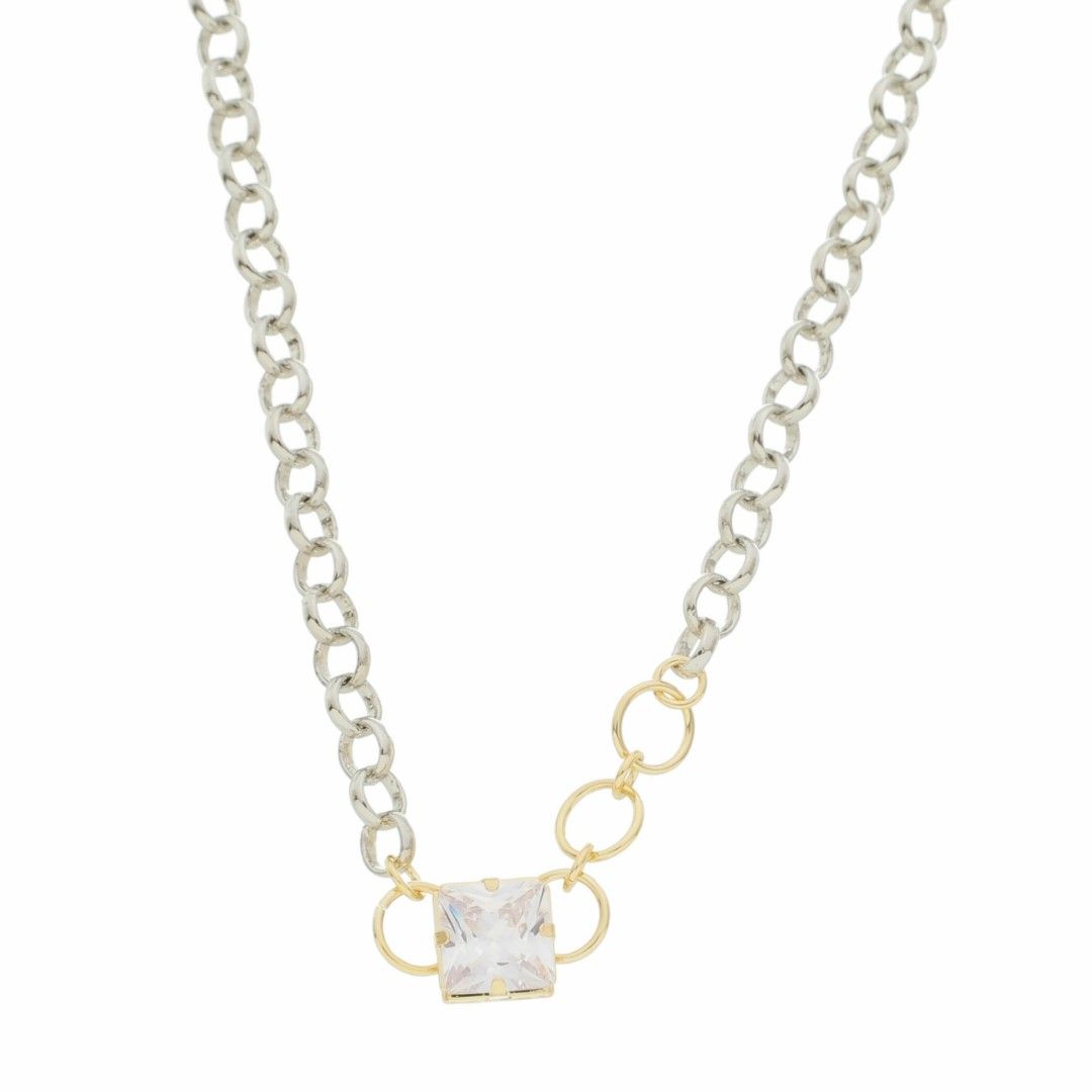 "A choker Ester é confeccionada numa corrente de elos português, fecho tipo lagosta, extensor e é folheada em ródio branco e um pingente quadrado fixo de zircônia na cor cristal folheado a ouro 18k.