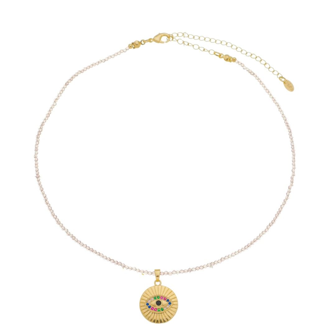"A choker Kali é toda confeccionada em zircônias lapidadas na cor rosa, possui um pingente central redondo com olho grego cravejado de zircônias nas cores safira, rosa, esmeralda e pink, possui fecho lagosta, extensor e é folheada a ouro 18k.