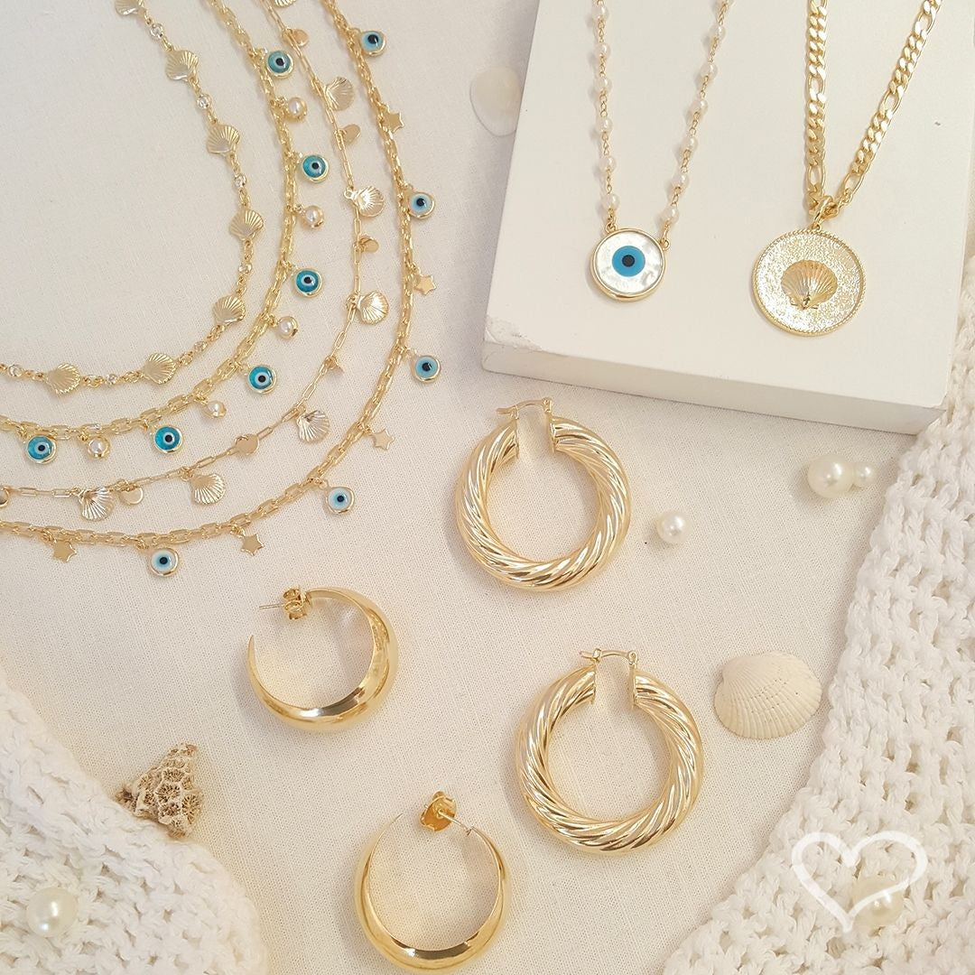 "A choker Lara é composta por uma corrente de elos, com pingentes de olho grego em resina pendurados e com mini estrelas de metal por toda sua extensão, possui fecho lagosta, extensor e é folheada a ouro 18k.