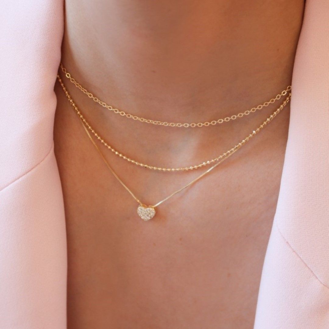 Design Exclusivo Piuka, as três correntes criam um visual em camadas que alonga o pescoço e valoriza o colo, ideal para usar com decotes em V ou gola alta. O pingente de coração com zircônias cravejadas é uma prova de que a beleza está nos detalhes. É a peça perfeita para expressar carinho e feminilidade.