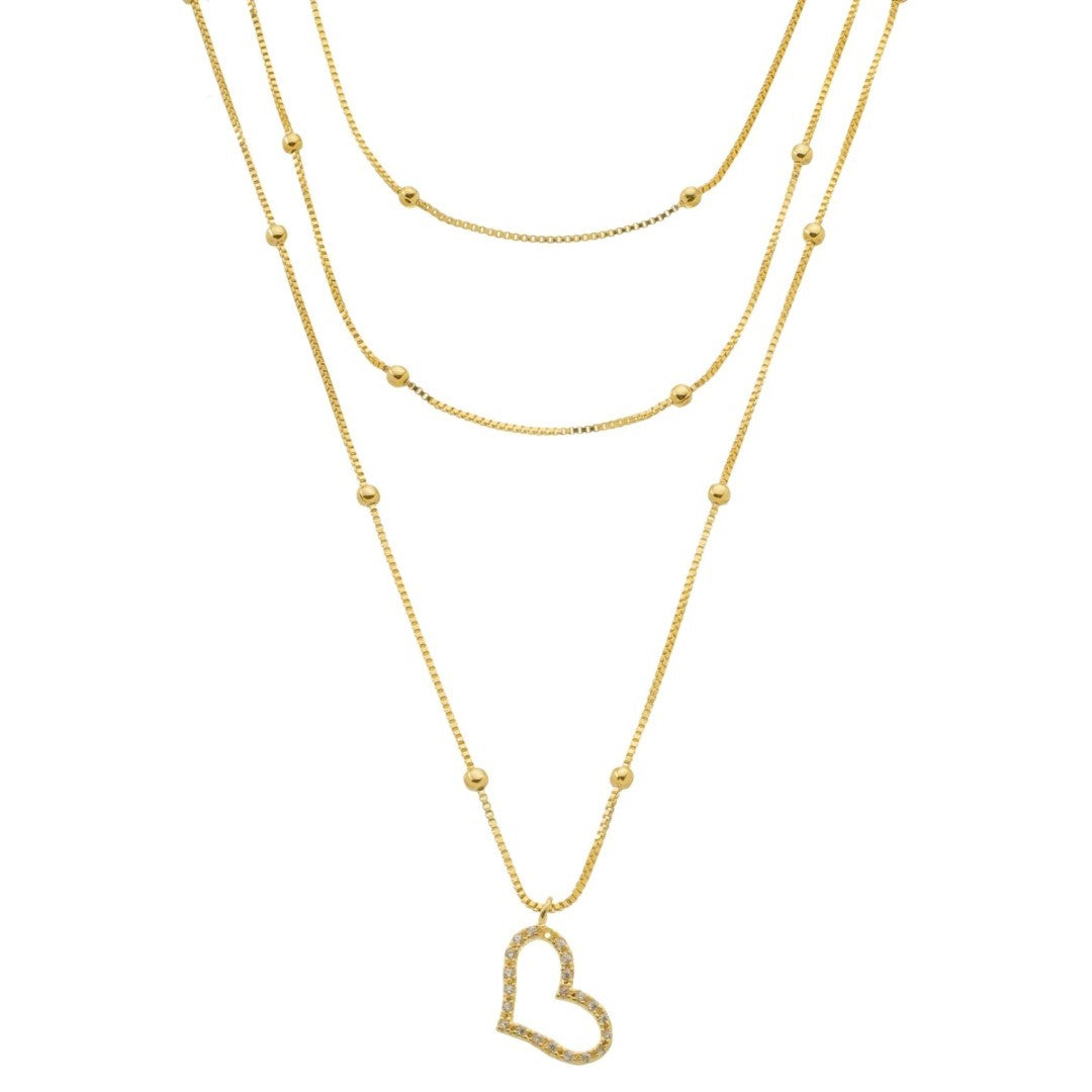 "O colar Larissa é confeccionado em uma corrente veneziana intercalado com bolinhas de metal e um coração fixo cravejado em zircônias na cor cristal, possui fecho tipo lagosta, extensor e é folheado a ouro 18k.
