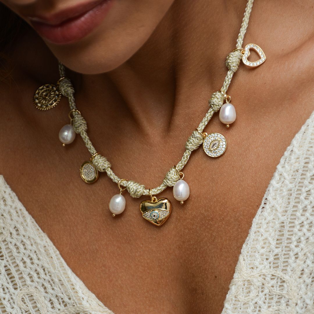O colar Clara é a escolha perfeita para quem busca um acessório moderno, delicado e repleto de charme. Seu design combina um cordão nude com nós, que traz um toque contemporâneo, aos pingentes irresistíveis: coração, pérola, olho grego e medalhas adornadas com zircônias cristal. Cada detalhe é folheado a ouro 18K, garantindo brilho duradouro, alta qualidade e a sofisticação característica da Piuka.