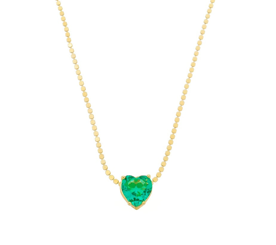 O colar Maria Antônia é composto por uma corrente de mini bolinhas achatadas, com pingente em formato de coração cravejado com uma zircônia na cor turmalina, possui fecho lagosta, extensor e é folheado a ouro 18k.