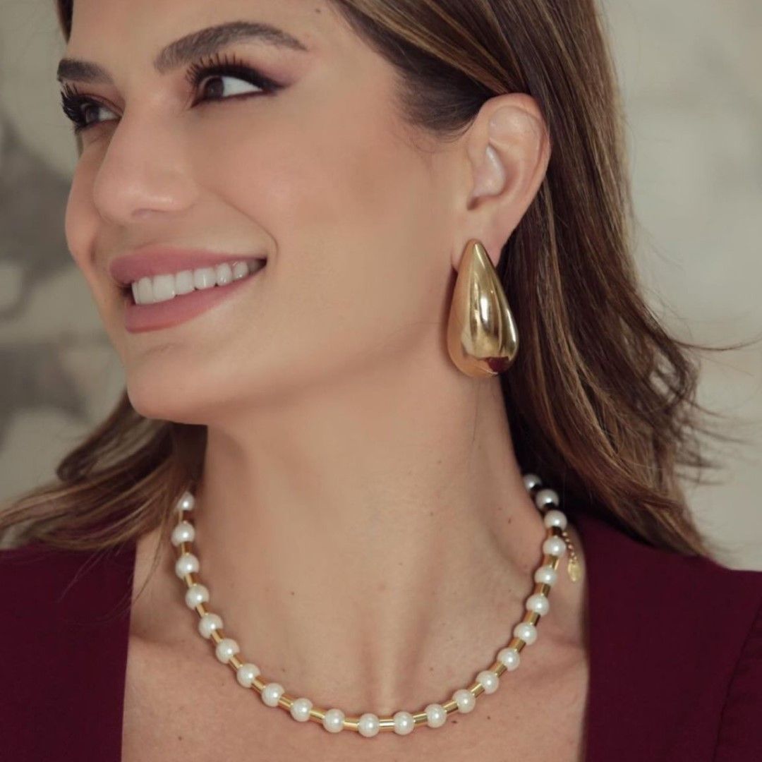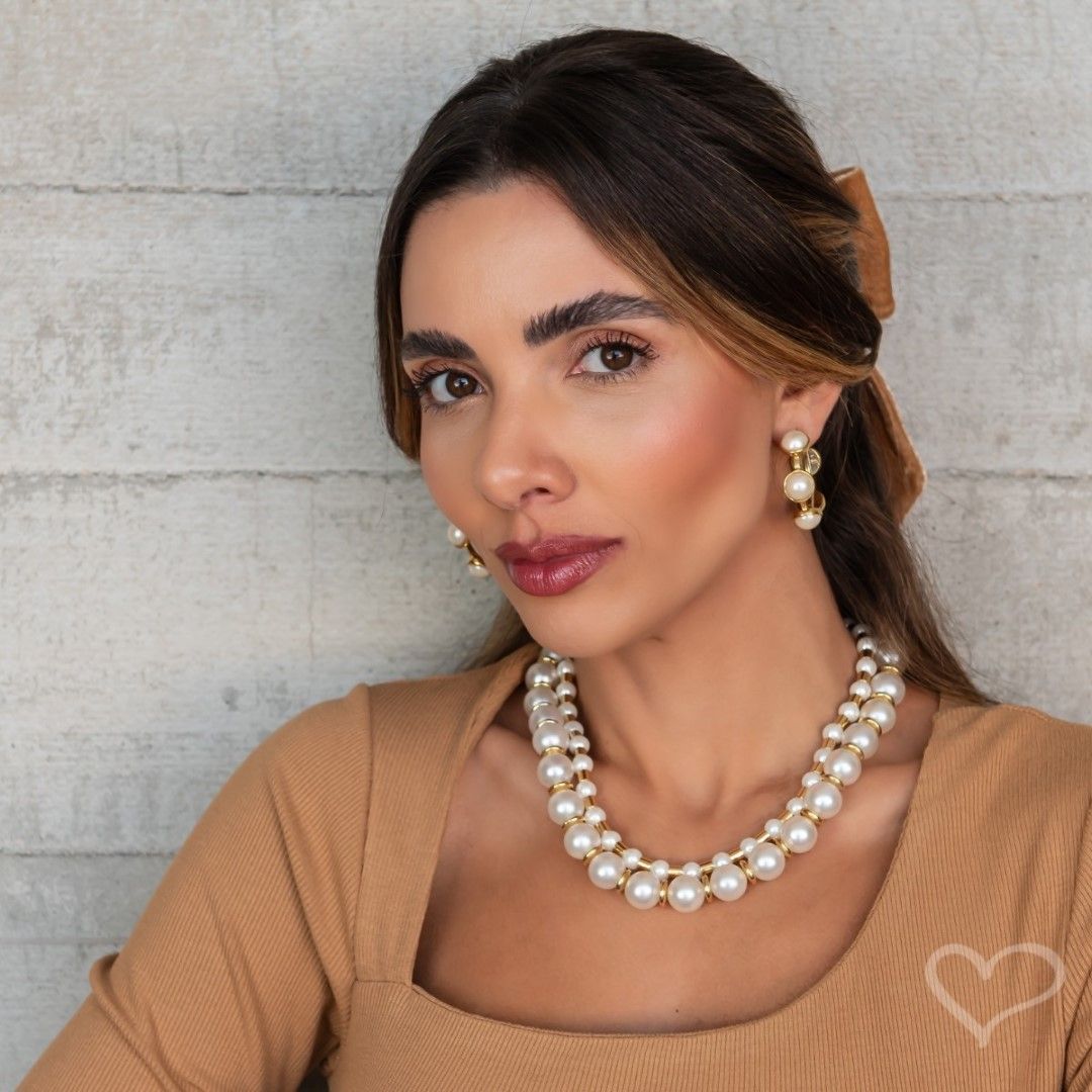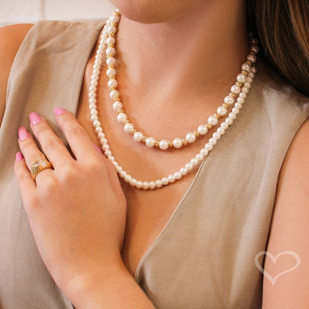 Apresentando o Colar Leonor, uma deslumbrante composição de pérolas intercaladas com elegantes tubos de metal, completo com extensor ajustável, fecho tipo lagosta, e delicadamente folheado a ouro 18k.