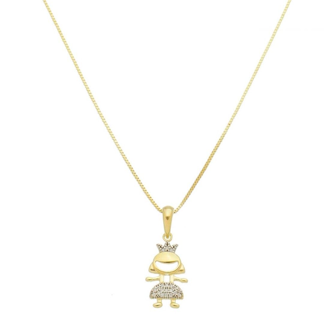 O colar Piuka Filha, é composto por uma corrente fina, pingente vazado princesa cravejado com zircônias na cor cristal, fecho lagosta, extensor e é folheado a ouro 18k.
