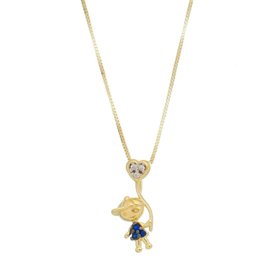 "O colar Piuka Filho, é composto por uma corrente tipo veneziana, pingente de menino com boné, e zircônias na cor safira, com pontos de ródio negro na roupinha, balão de coração com zircônias na cor cristal, fecho lagosta, extensor e é folheado a Ouro 18k.