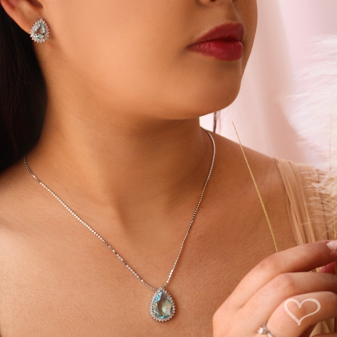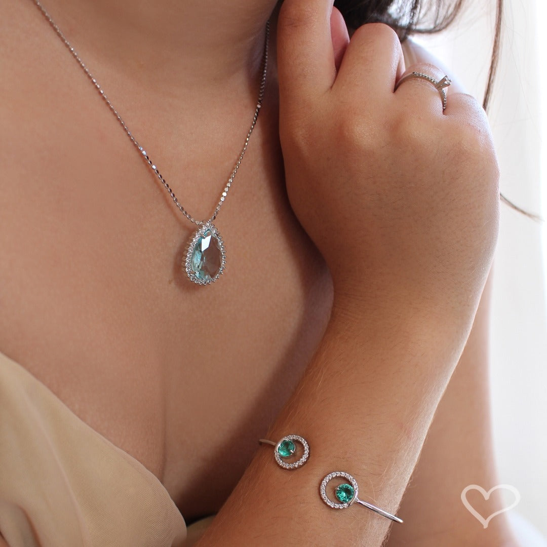 O colar Maria Fernanda é composto por uma corrente de mini bolinhas achatadas de metal, com um pingente em formato de gota com uma zircônia central na cor acqua e é cravejado por toda sua volta por mini zircônias na cor cristal, possui extensor fecho lagosta e é folheado em ródio branco.