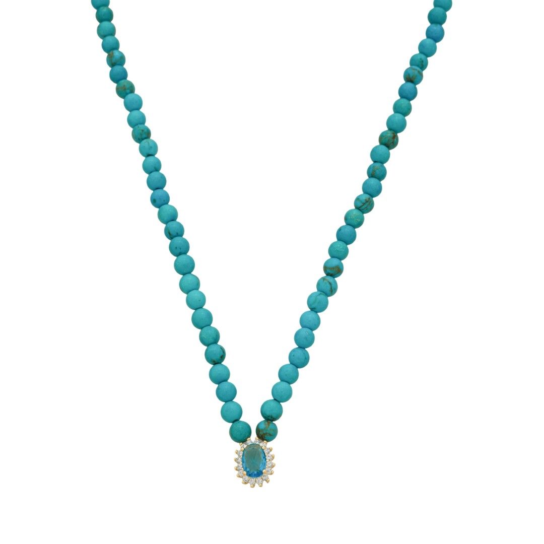 O colar Nádia da Piuka combina leveza, modernidade e um toque místico, ideal para mulheres que buscam acessórios marcantes sem abrir mão da delicadeza. Confeccionado em fio de nylon resistente, o modelo apresenta mini bolinhas de howlita turquesa, que adicionam cor e personalidade ao look. No centro, o pingente com zircônias turquesa e cristal garante brilho extra e um acabamento sofisticado, perfeito para valorizar o colo em qualquer ocasião.