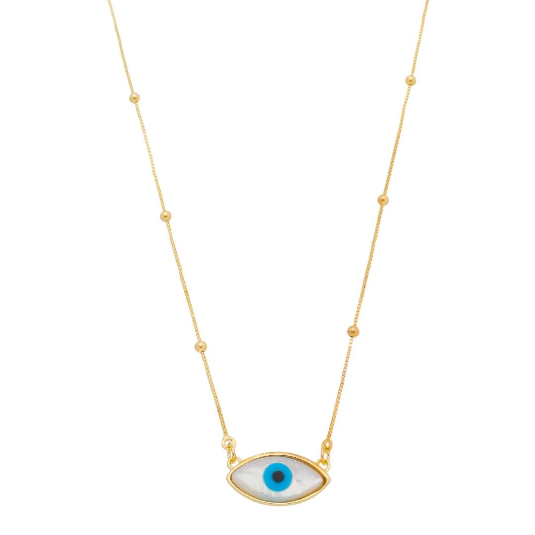 "O colar Kika é composto por uma corrente fina, um pingente madre pérola pequeno de olho grego, fecho lagosta, extensor e é folheado a ouro 18k.