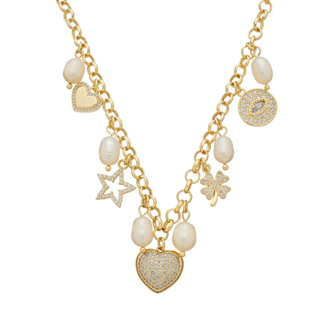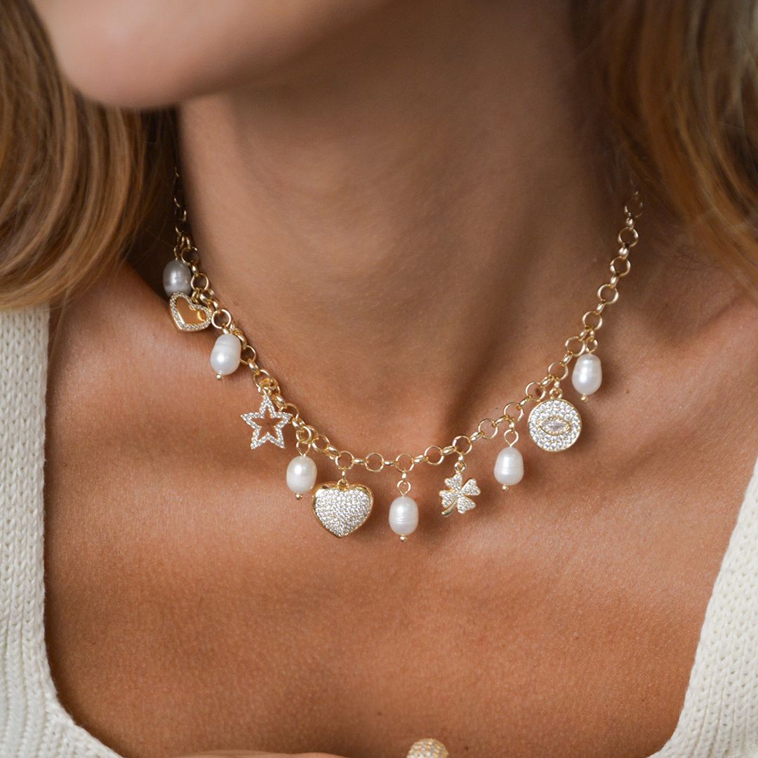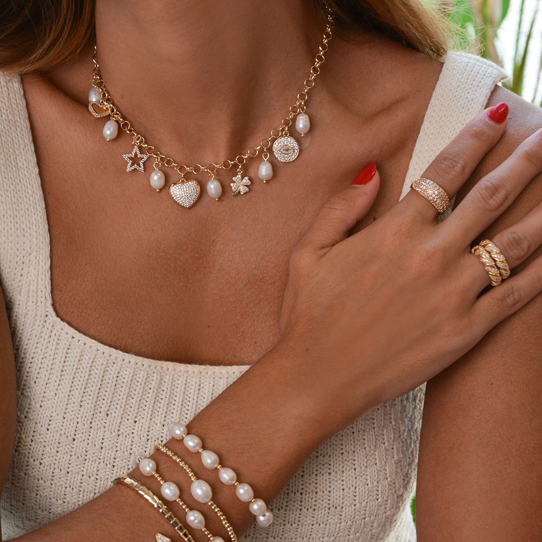 Seus pingentes foram cuidadosamente selecionados para transmitir charme e boas energias: a pérola simboliza pureza, o coração representa amor, a estrela ilumina seu caminho, o trevo de quatro folhas atrai sorte e a medalha de olho grego oferece proteção. Juntos, eles criam um design único e cheio de simbolismo, ideal para complementar looks casuais ou sofisticados.