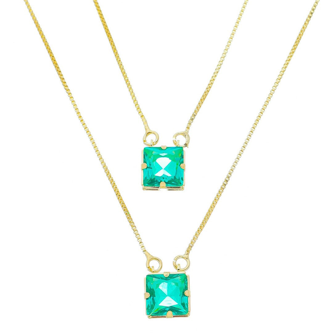 "O escapulário Renata é composto por uma corrente veneziana com uma pedra de zircônia turmalina quadrada em cada ponta e é folheado a ouro 18k.