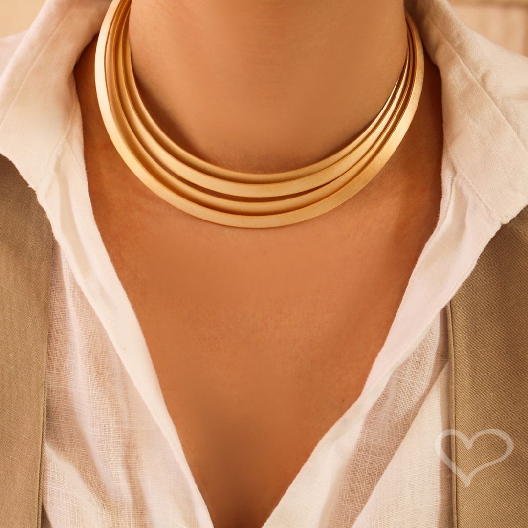 Descubra a sofisticação única da Gargantilha Agnes, uma verdadeira obra de arte em metal acetinado, adornada com um elegante acabamento em folheado a ouro 18k.