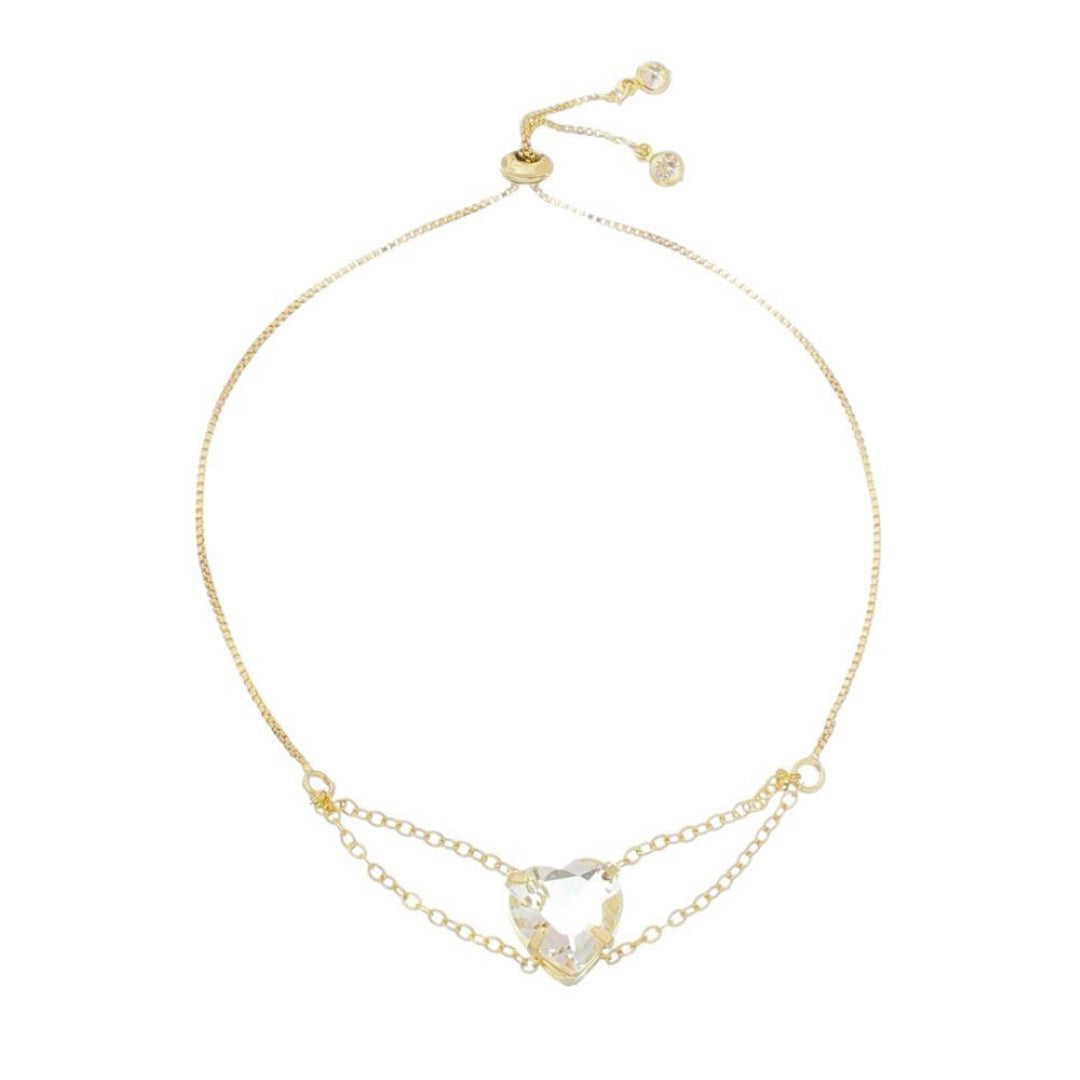 "A pulseira Breila ajustável Coração zircônia é uma pulseira ajustável, folheada a ouro 18k, composta por pingente central no formato de coração em zircônia cristal com corrente diamantada dupla e terminais em zircônia na cor cristal.