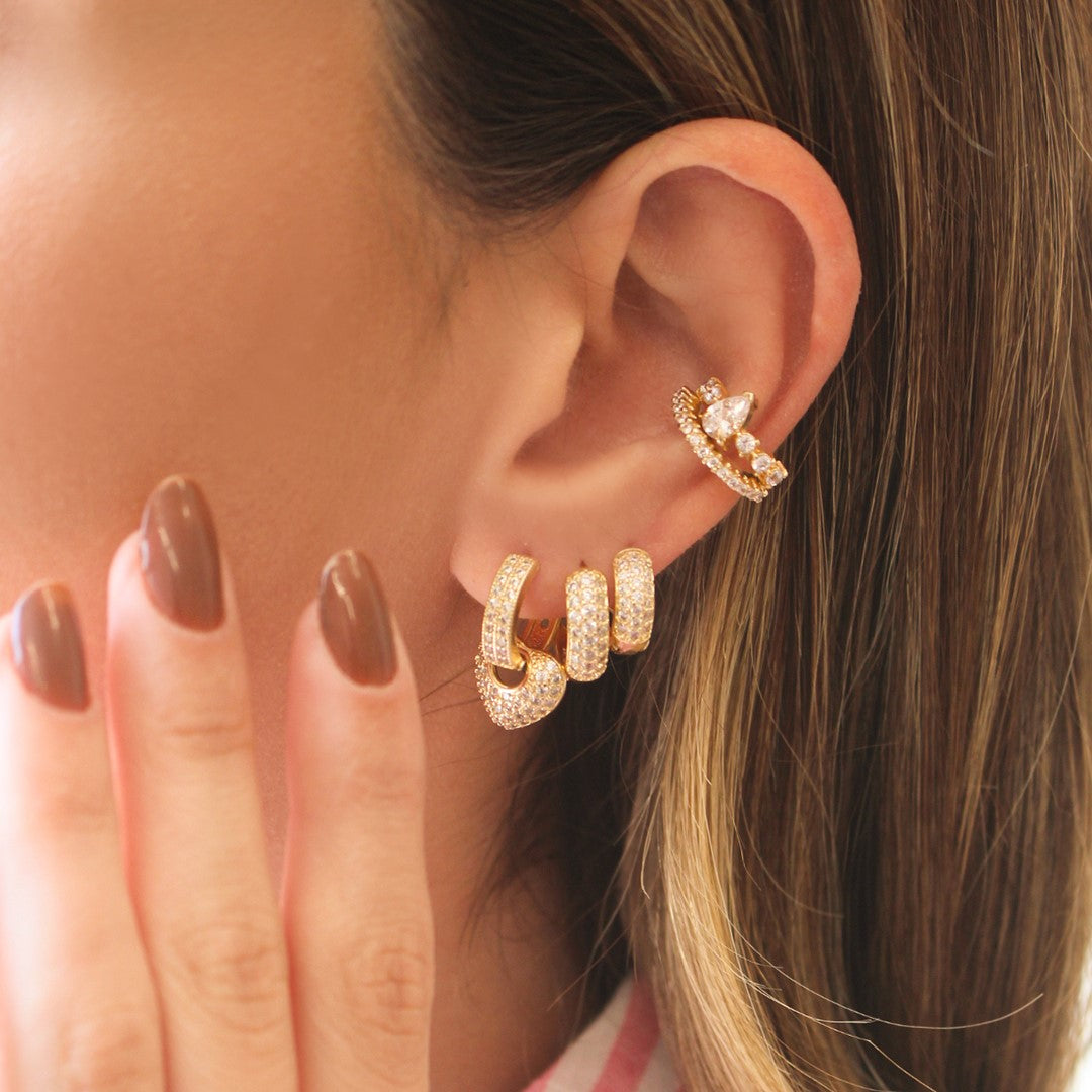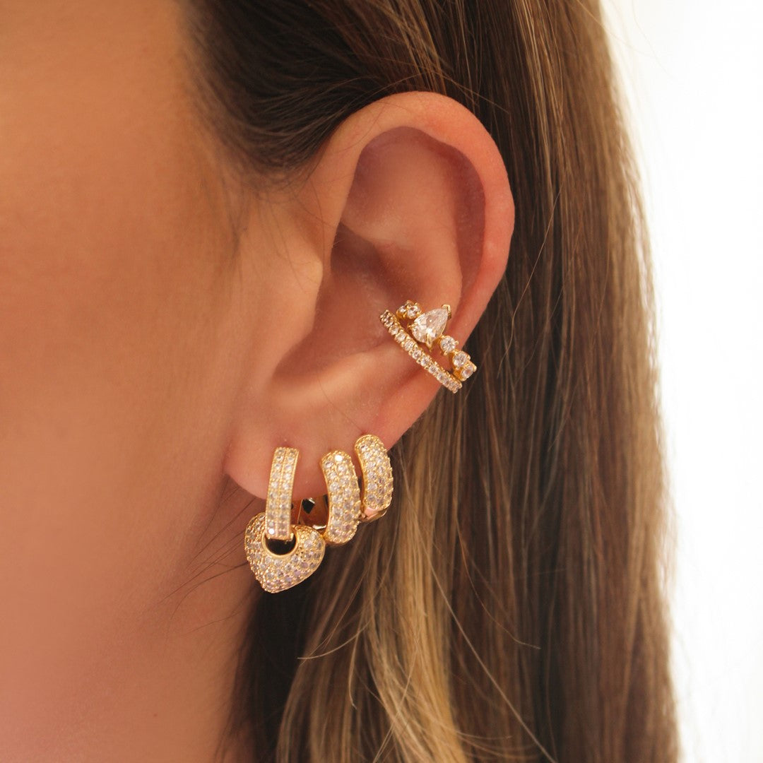 O conjunto é composto por três argolas de tamanhos diferentes. A argolinha G vem com um pingente de coração removível, permitindo que você personalize o uso conforme a ocasião. As outras duas argolinhas são totalmente cravejadas com zircônias brancas, garantindo um brilho intenso e sofisticado.