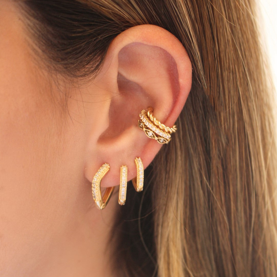 O trio é composto por três argolas em formato geométrico, com estrutura quadrada e acabamento impecável. Todas são cravejadas com zircônias cristal, que proporcionam um brilho sofisticado e valorizam o contorno da peça. O banho em ouro 18k garante durabilidade, resistência e uma aparência luxuosa.