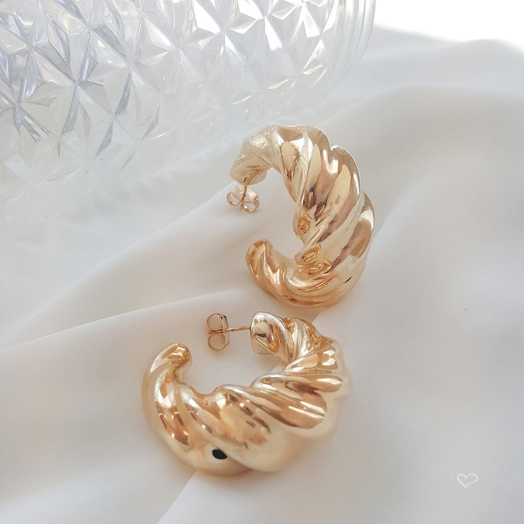 "O brinco Natália é uma argola larga tipo croissant e é folheado a ouro 18k.