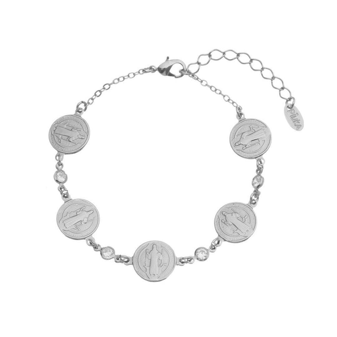 Com cinco medalhas de São Bento intercaladas por zircônias na cor cristal e folheada em ródio branco é o tipo de acessório para ter sempre por perto.